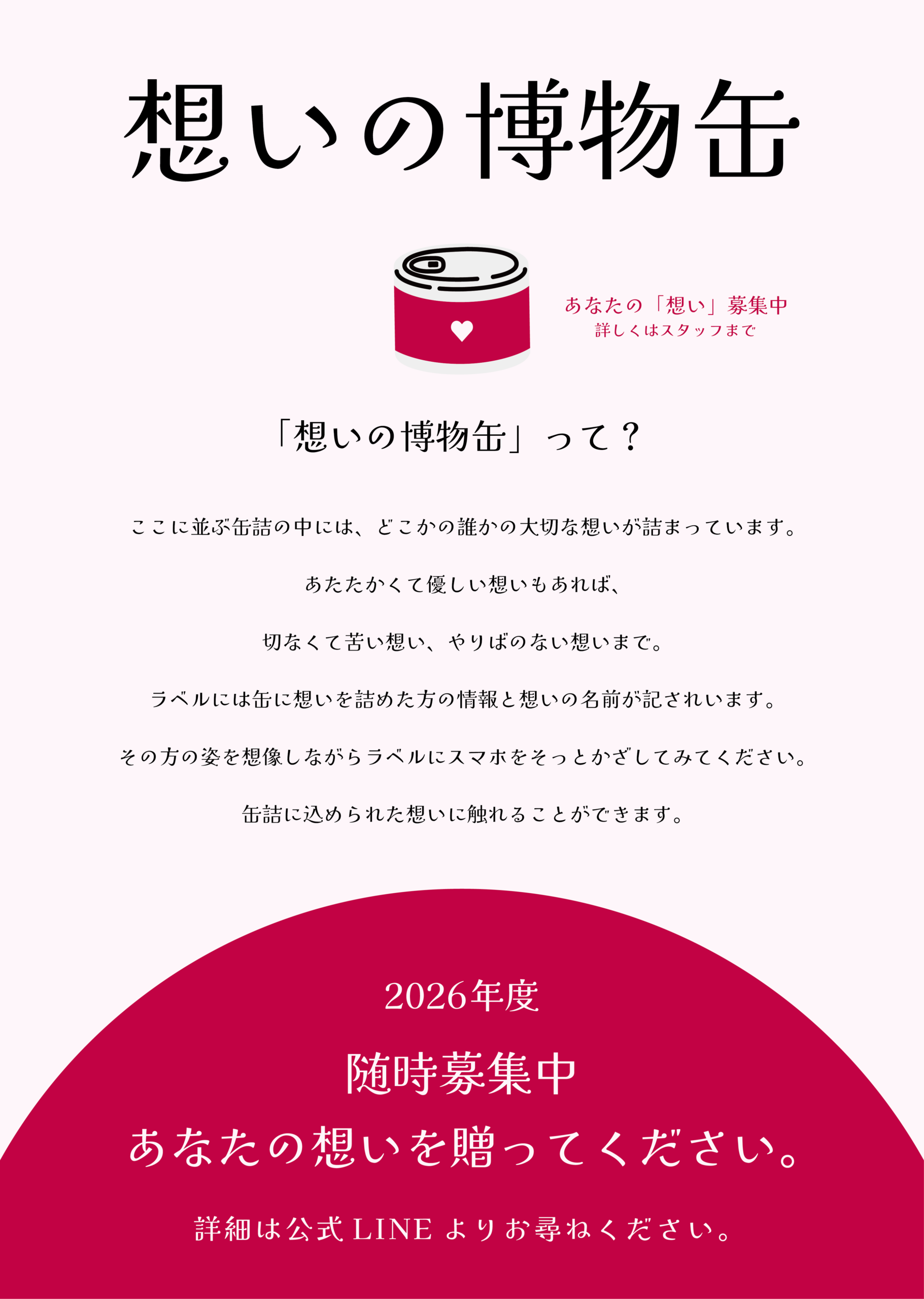 喜怒哀楽、悲喜交々、そこに並ぶモノは「想いそのもの」であり、その「コト」に触れるあなたの胸に生まれる想いもまた、「想いの博物缶」にとって、大切な想いとなります。